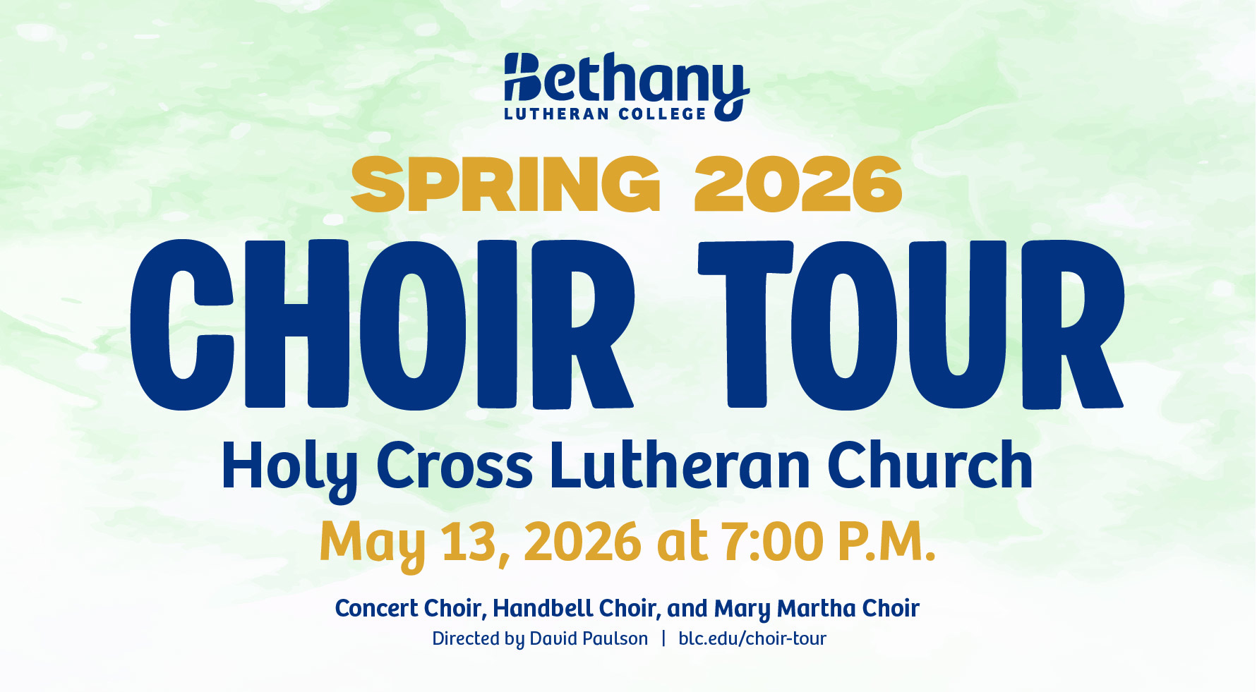 Mark your calendars for Wednesday, May 13 at 7 pm! We’re really looking forward to hosting Bethany Lutheran College Choir during their spring tour. They’ll be at Holy Cross the evening of May 13 with the Concert Choir, Handbell Choir and Mary Martha Singers . The concert will be uplifting and an opportunity for you to experience our college in action!